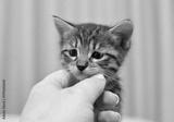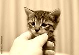 A woman's hand pets a cute little fluffy tabby kitten at home. It's a Kurilian Bobtail with a short tail.