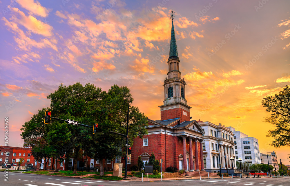 First Baptist Church of Denver, Colorado, at sunset. The historic brick church and its steeple are lit by warm golden light under a dramatic, colorful sky
