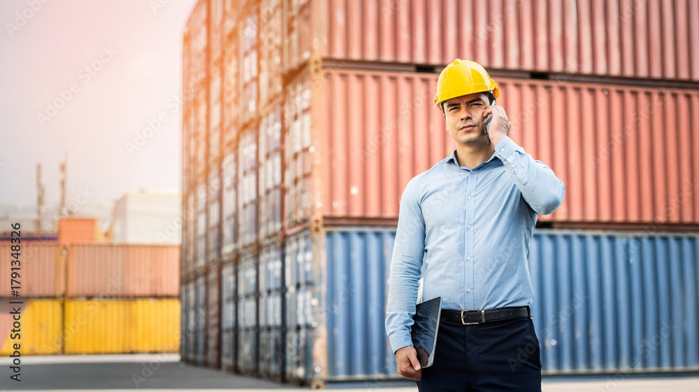 Worker use smartphone and ipad about business working at the port for transfer products.