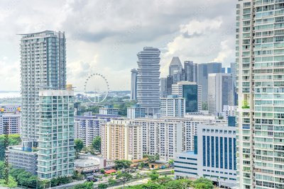Public residential condominium building complex and downtown skylines at Kallang neighborhood in Singapore. Storm cloud sky.