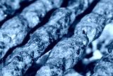 Close-up of several long, minced meat kebabs, lula or kofta, grilling on metal skewers over hot charcoal embers.