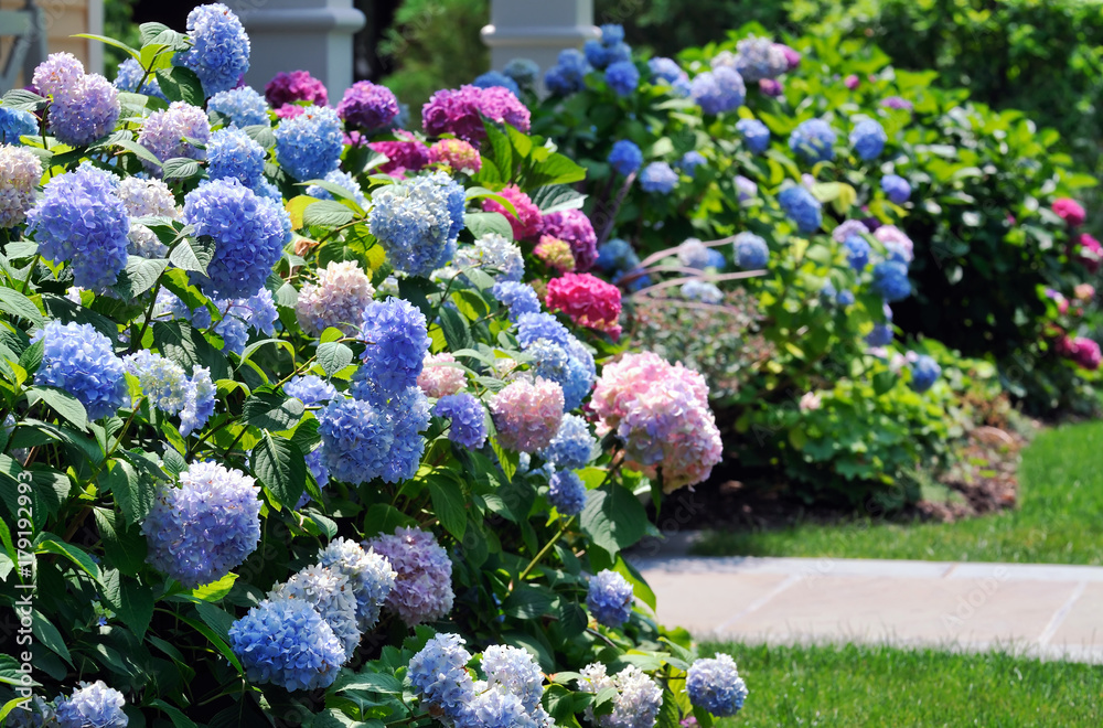 Hydrangeas Flowers In Blue, Pink And Purple Blooming In The Garden