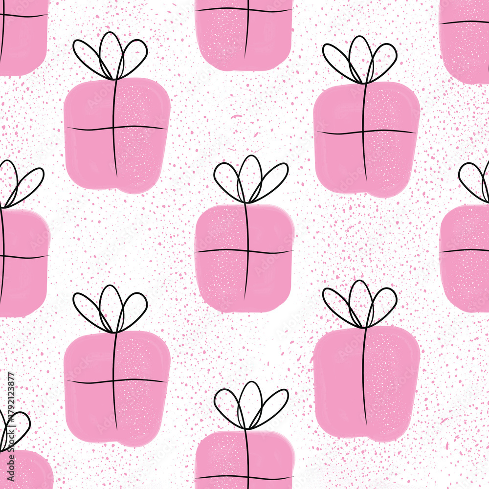 Seamless pattern with gift boxes. Graphic print with doodle presents. Hand drawn packaging with dot seamless pattern with hearts and flowers, seamless pattern with flowers, seamless pattern with heart