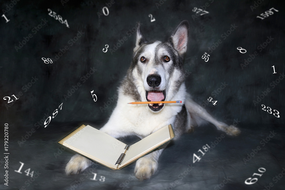 Fibonacci numbers around a funny a dog holding a pencil in its mouth