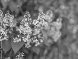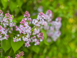 Pink lilac blossoms on green leaves in sunny garden with blurred background.