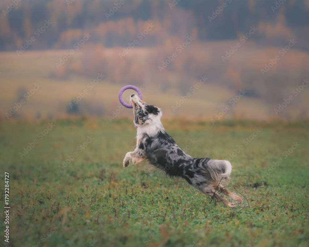 Australian Shepherd dog flying through the air to catch a purple ring toy in a vast autumn field.