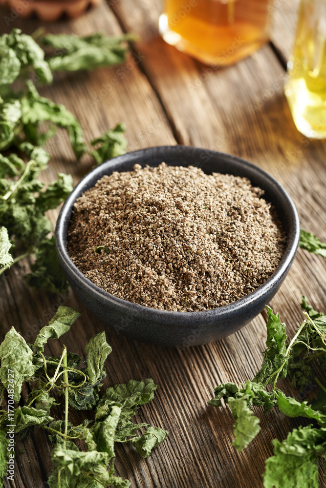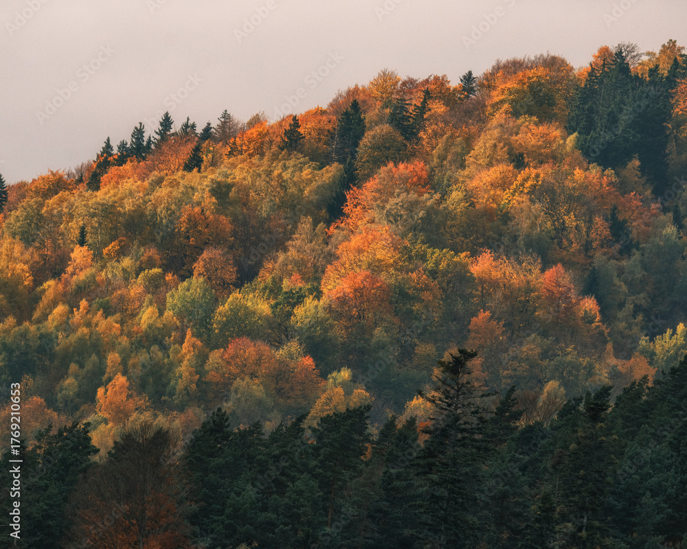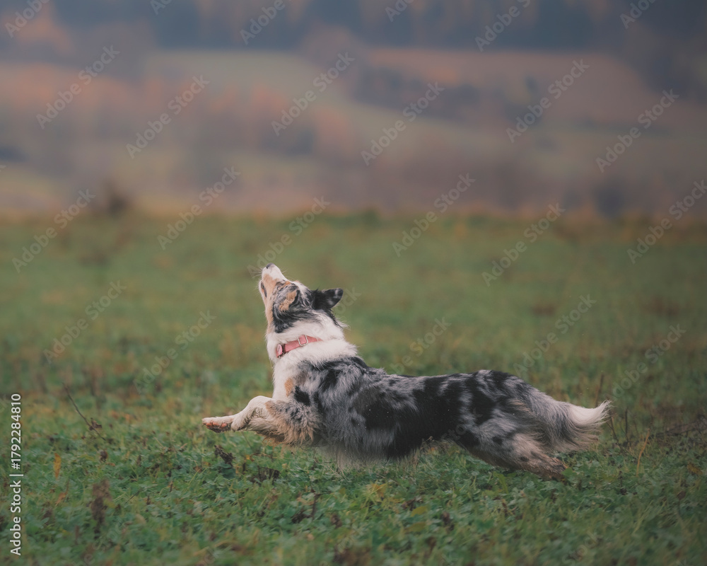 Dynamic shot of a merle Australian Shepherd dog mid-run or jump across a green, grassy field in autumn.