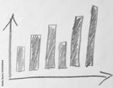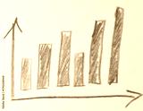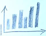 A hand-drawn bar chart with an upward trend on white paper, drawn in red pencil.