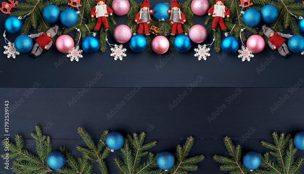 A frame of fir branches, blue and pink Christmas tree baubles, and Christmas doll figurines on a blue wooden background.