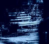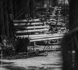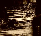 Vintage park bench with wrought iron elements and wooden planks, illuminated by the sun