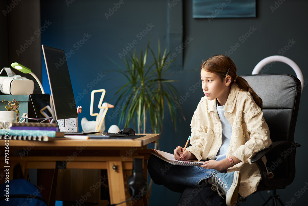 Caucasian girl sitting at desk writing in notebook while looking at computer monitor, long brown hair tied back, studying or doing homework in modern home office environment