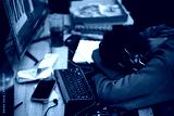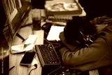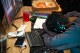 Young adult Black man wearing headphones sleeping at desk with head resting on arms near computer monitor, keyboard, smartphone, game controller, pizza box and drink visible on table