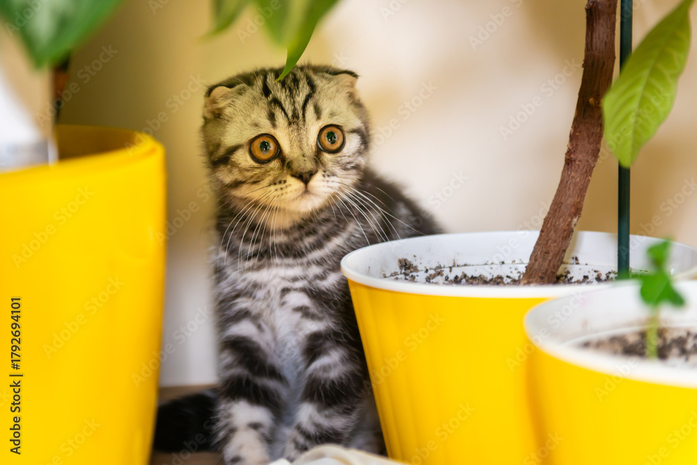 Cat little kitten in green home garden with green plant leaves. Purebred Scottish fold kitten