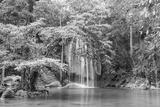 Beautiful waterfall in tropical jungle forest with big green tree and emerald lake on foreground. Nature landscape of Erawan National park, Kanchanaburi, Thailand