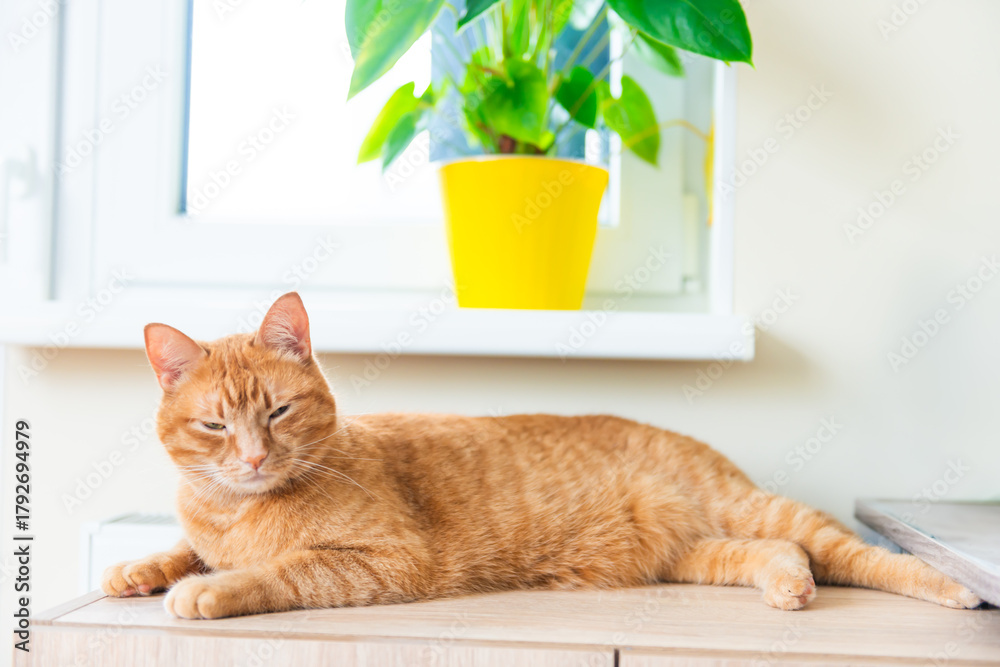 Red domestic cat laying in cozy room with window and green house plant
