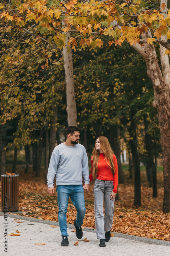 pairs of friends or lovers exploring colorful autumn trail with cozy attire and warm interactions