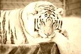 Big adult ginger tiger lying and sleeping on the tire in the zoo