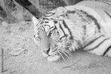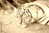 Big adult ginger tiger lying and sleeping on the tire in the zoo