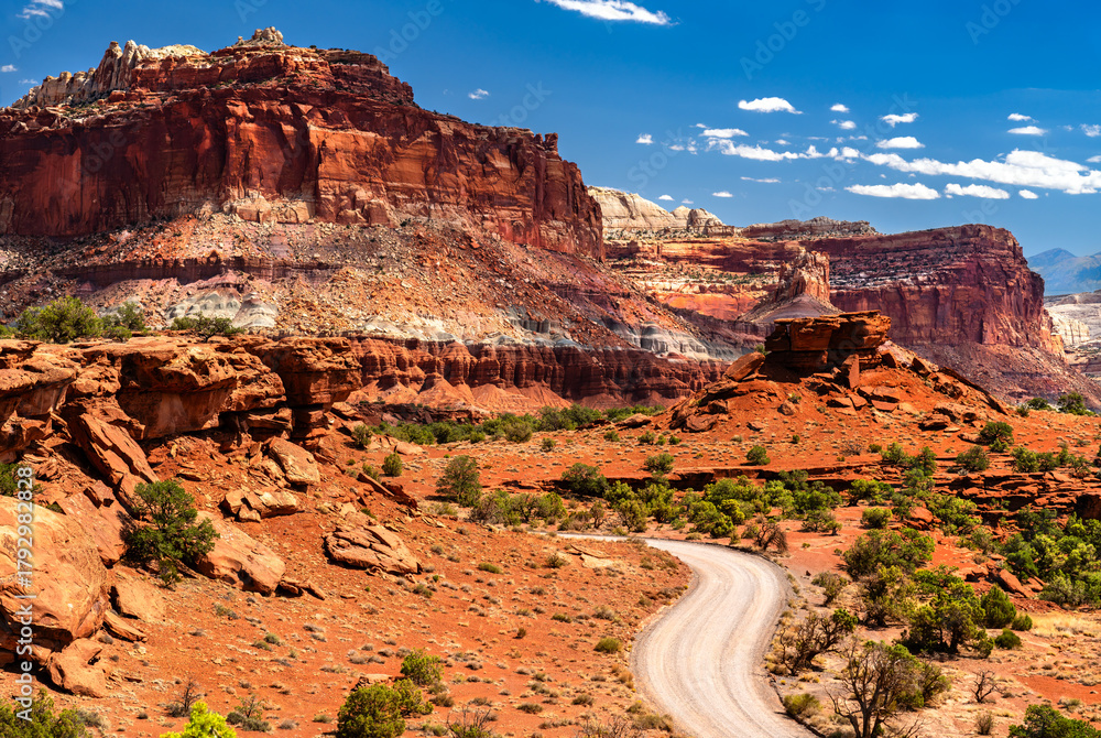 View from Panorama Point of the unpaved Goosenecks Road winding through Capitol Reef National Park. Massive red rock formations rise under a blue sky with clouds