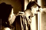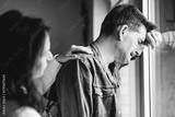 couple enjoying quiet time close to a window. The man crying and women consoling
