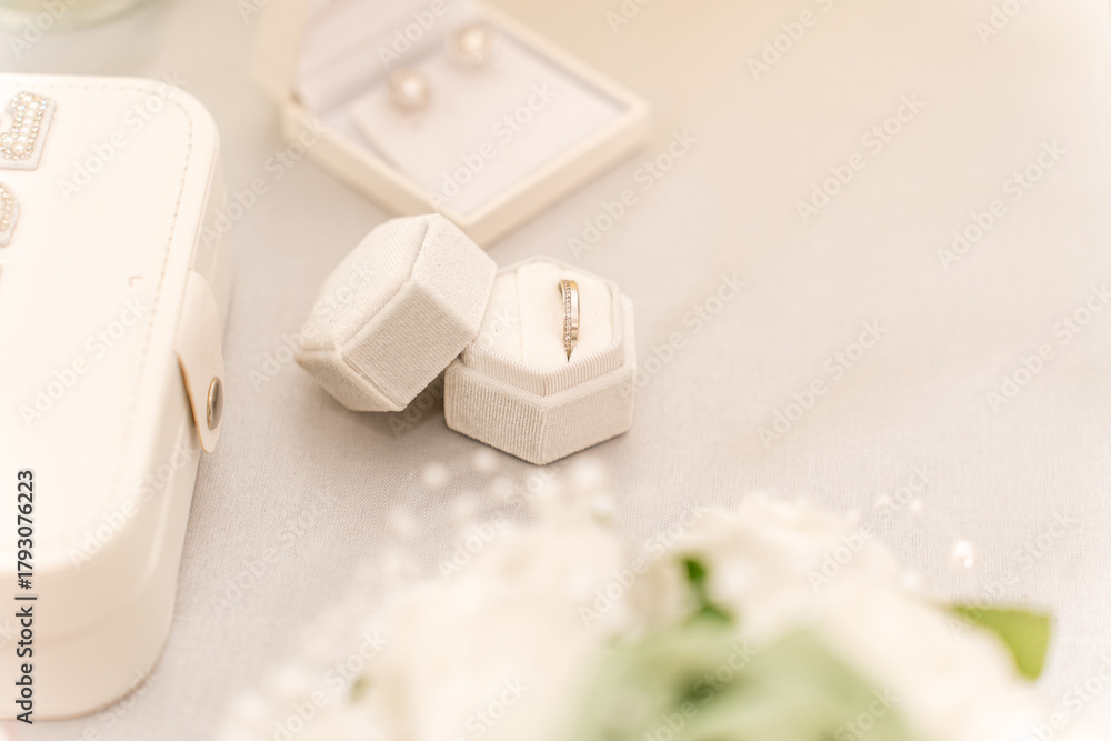 Elegant wedding rings and pearl earrings arranged for a bridal celebration at a stylish venue
