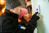 Portrait of a frozen couple sitting frustrated on the sofa in the living room in winter outerwear at home and trying to keep warm.