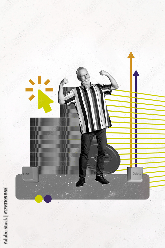 Vertical art trend collage of happy businessman show biceps receive dollar currency income keypad buttons usd capital profit