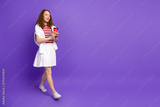 Young woman with cup smiles against purple background in casual stylish fashion portrait