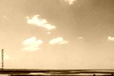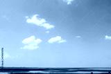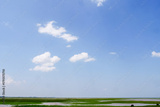 Azure Vista: A panorama of a bright and beautiful scene, where fluffy clouds drift gracefully across the vast blue sky above a verdant, low-lying landscape.