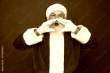 Winter noel sale discount reactions emotion concept. Stylish Santa white beard in costume headwear spectacles scream with open mouth staring eyes hear incredible news isolated on red background