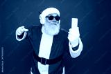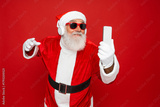 Crazy santa claus with grey beard wireless modern headset headphone holding smart phone looking at mobile screen listen music dance wear sunglass cap isolated bright shine red color background