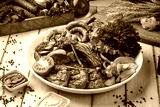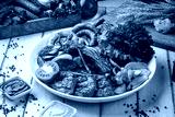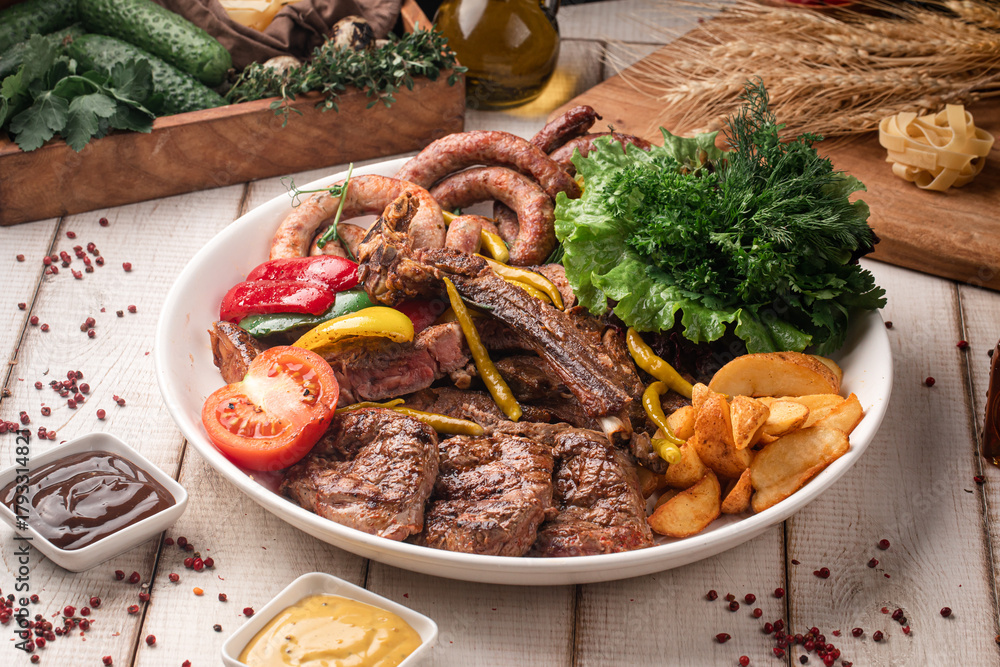 Assorted grilled meats with vegetables, herbs and fried potatoes served on a large round plate