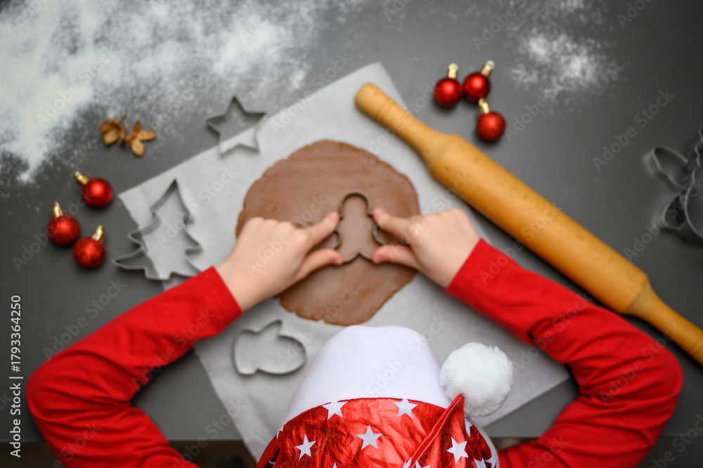 Top view of child making gingerbread cookies with Christmas mold on table, surrounded by festive decorations. Perfect for winter marketing, cozy home baking concepts, and joyful holiday designs.