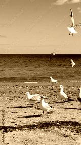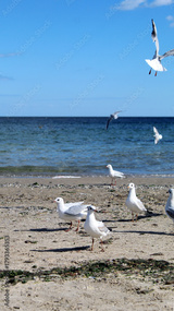 Seagulls gather on a sandy beach near the ocean under clear blue skies