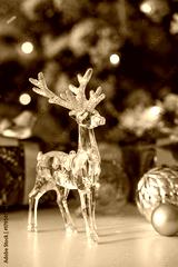 Crystal Reindeer with Gold Antlers and Christmas Gifts in Festive Interior