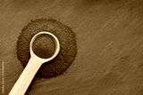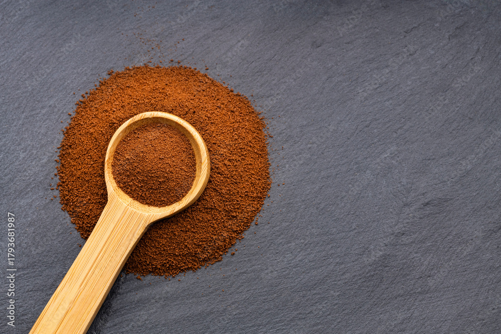 Coffea - Teaspoon of organic instant ground coffee on a chalkboard