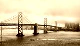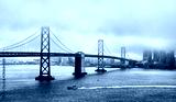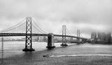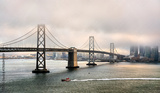 San Francisco-Oakland Bay Bridge emerges from thick fog, with the city skyline partially obscured. A small red boat travels across the bay in the foreground. This image has a moody, atmospheric feel