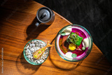Elegant fine dining presentation with artistic food on a wooden table