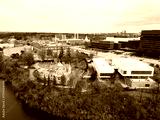 Aerial view of Earnscliffe National Historic Site in Ottawa surrounded by winter landscape and modern buildings. g.