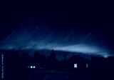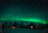 Northern lights (Aurora Borealis) over cottage in Lapland village. Finland
