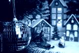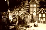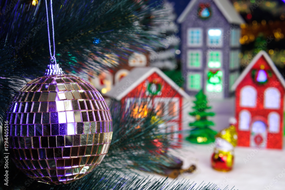 Behind the silver ball hanging on a Christmas tree branch, a Christmas village is partially blurred
