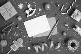 New Year and Christmas holiday decoration objects on red background with blank white paper sheet space in center