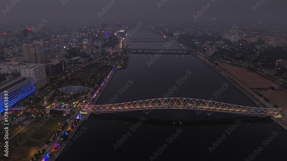 Atal Bridge, Ahmedabad City, Night Aerial View, Ahmedabad, Gujarat, India.