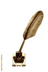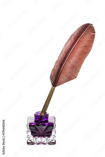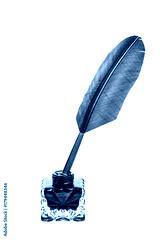 Literature concept. Fountain pen with feather near inkstand isolated on white