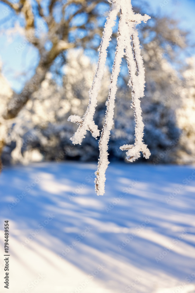 Frosty tree branch in a winter garden