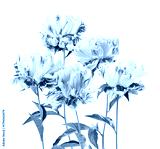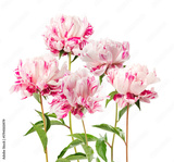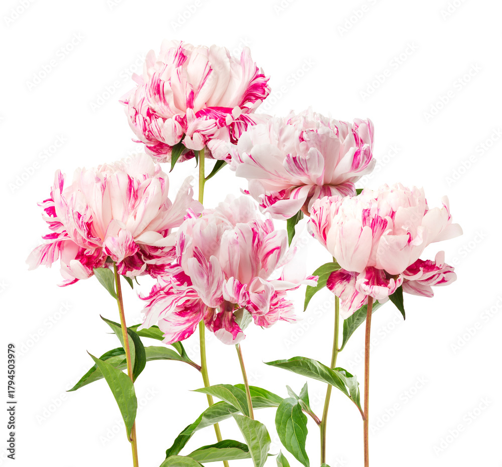 lush cluster of five vibrant striped peony flowers, showcasing spectacular pink and white variegated petals and robust green leaves, isolated on black.