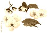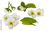 collection of white cherry or plum blossoms, showcasing delicate flowers, tight buds, and vibrant green leaves, isolated photograph on transparent background.
