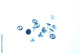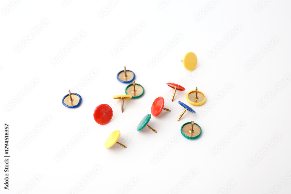 Colorful push pins scattered on white surface, ideal for office supply branding, educational content, stationery marketing, organizational tools, productivity visuals, school