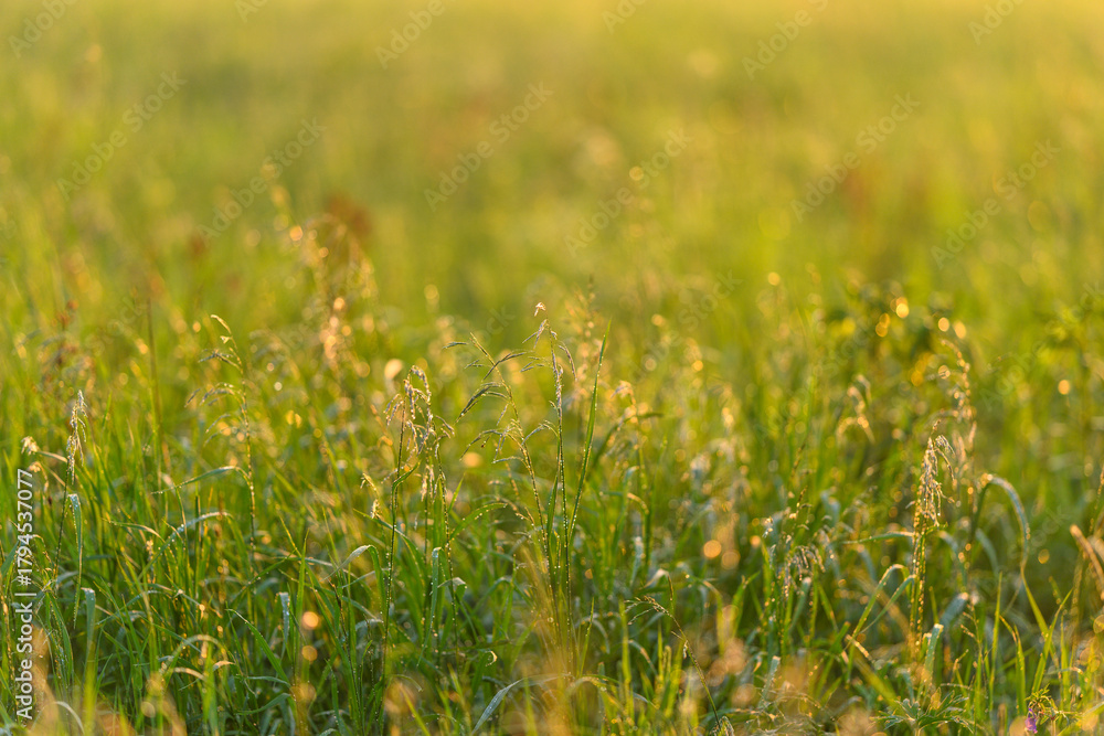 A Beautiful Golden Sunrise Casts Its Light Over A Lush, Green Field Filled With Life