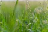 In the early morning, dew glistens on tall grass, creating a serene and beautiful scene in nature
